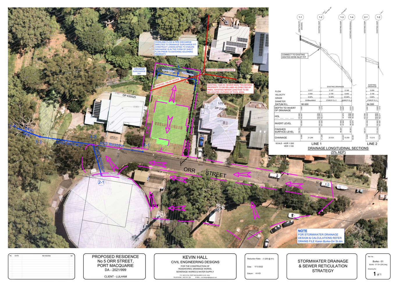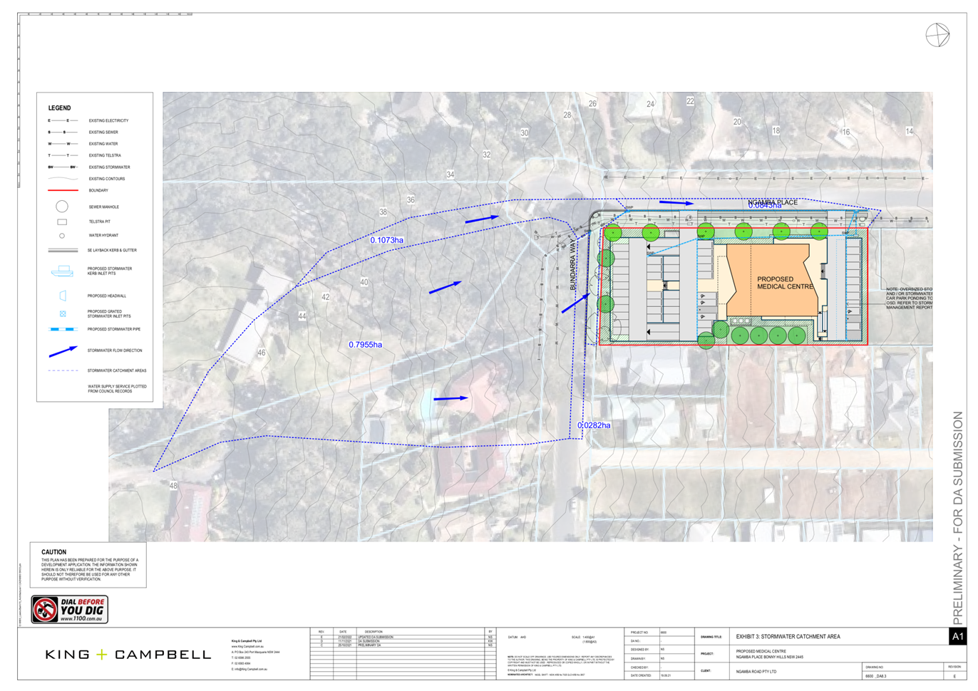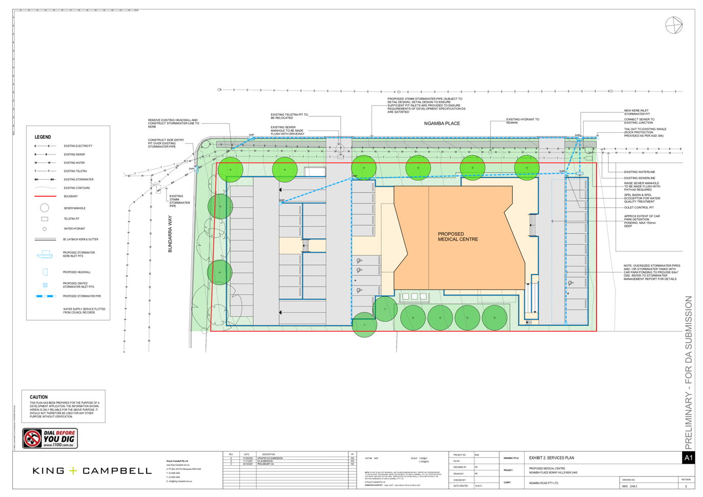 The site naturally grades towards the northern boundary and is currently (un)serviced. The legal point of discharge for the proposed development is defined as direct connection into the proposed 375mm pipe along Ngamba Place.