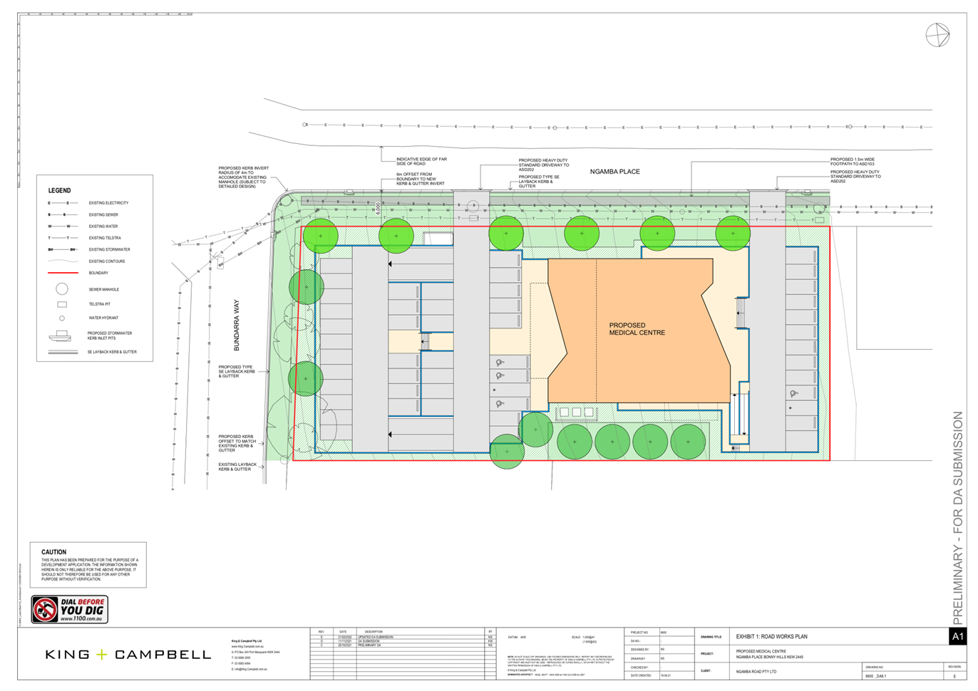 The proposed development seeks to provide the following improvements within the public road reserve: · Line-marking and raised median at the intersection of Ngamba Place and McGilvray Road, · Upgrading of the eastern side of Ngamba Place to include a wider road surface and upright kerb and gutter, · Improved piped stormwater network for the full length of the sites Ngamba Place frontage, and · Installation of a 1.2m wide concrete footpath for the full length of the sites Ngamba Place frontage. It is noted that the other side of Ngamba Place is zoned R1 General Residential and is capable of being development. At which time the other side of Ngamba Place will be upgraded with kerb and guttering. The application does not seek to undertake works to the western side of Ngamba Place. |