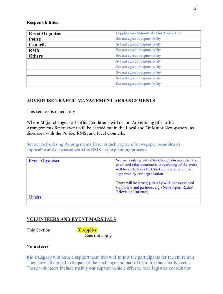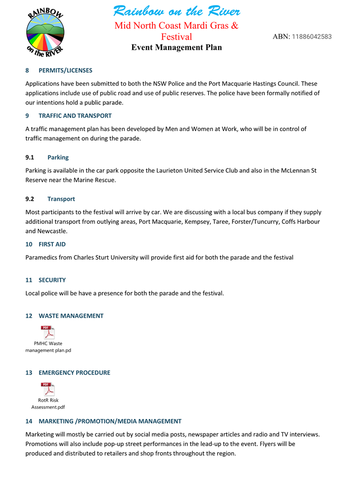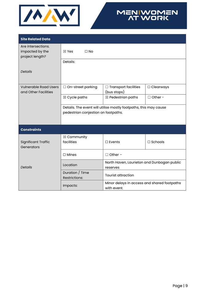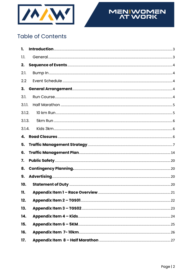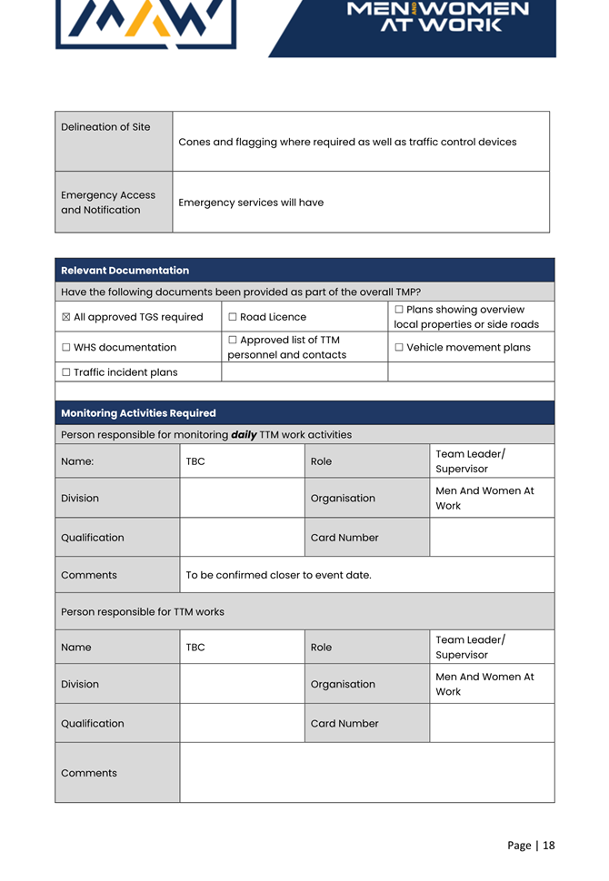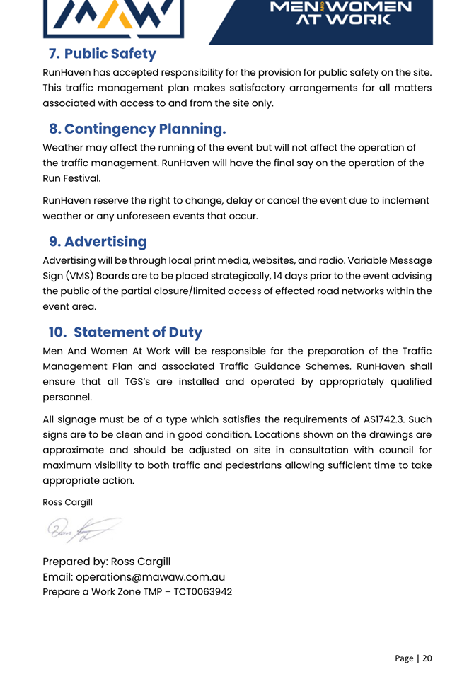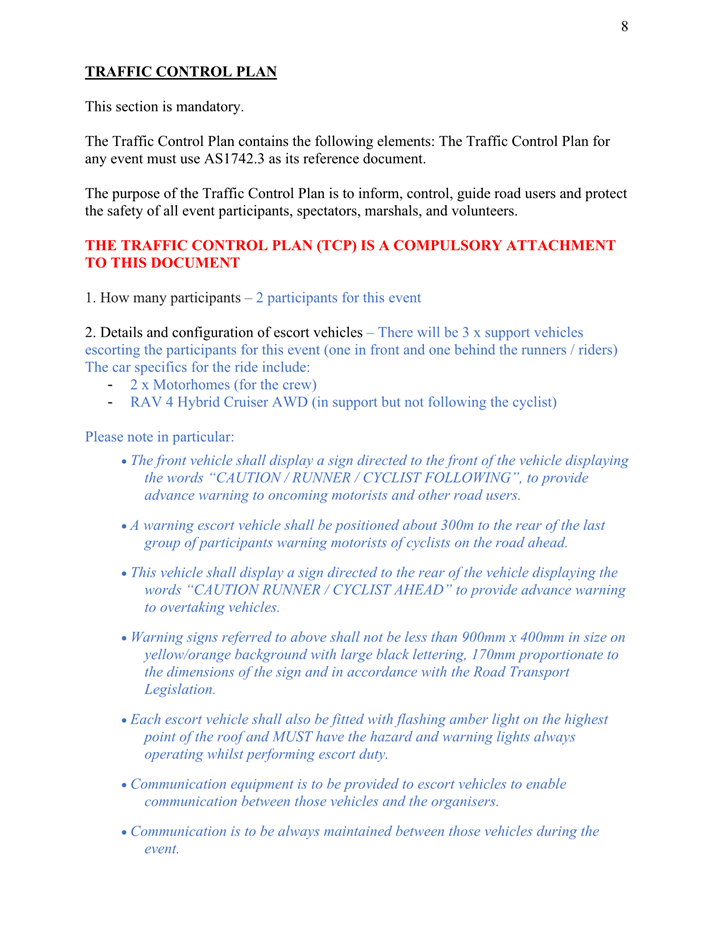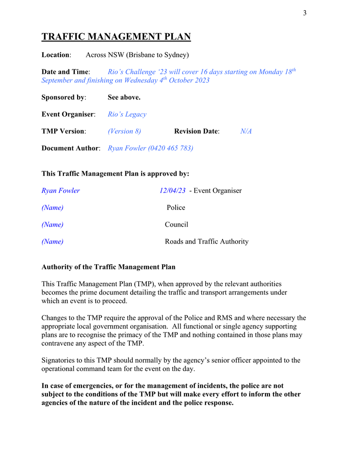 8. The event organiser must have this approval and the Transport Management Plan and Traffic Guidance Scheme described above on site at all times for the duration of the event.