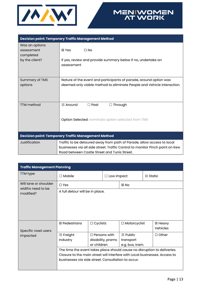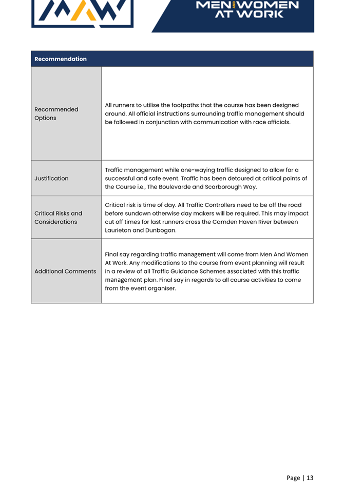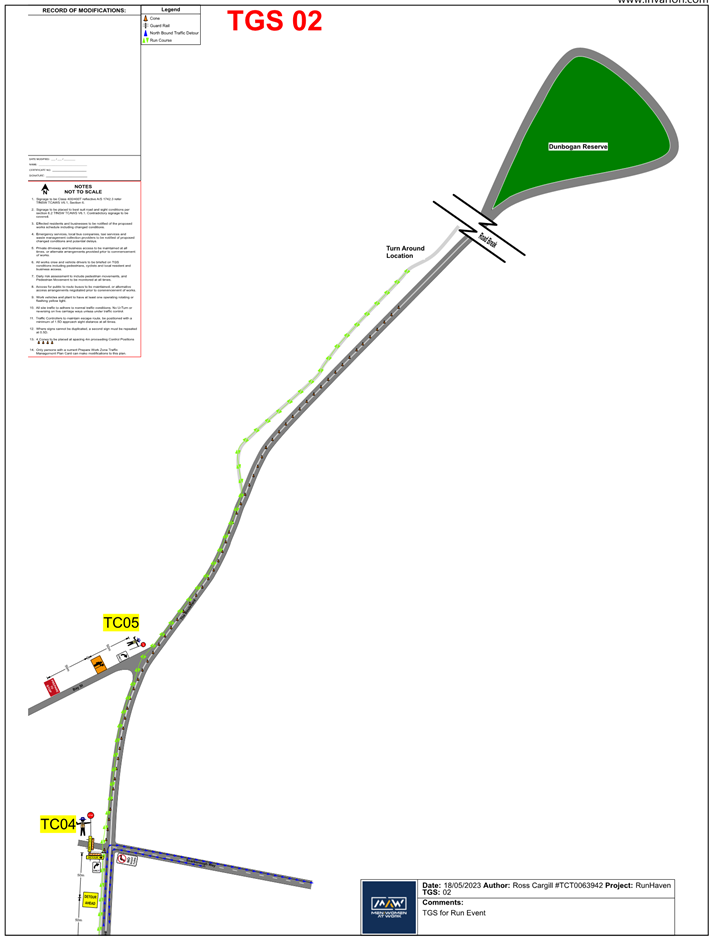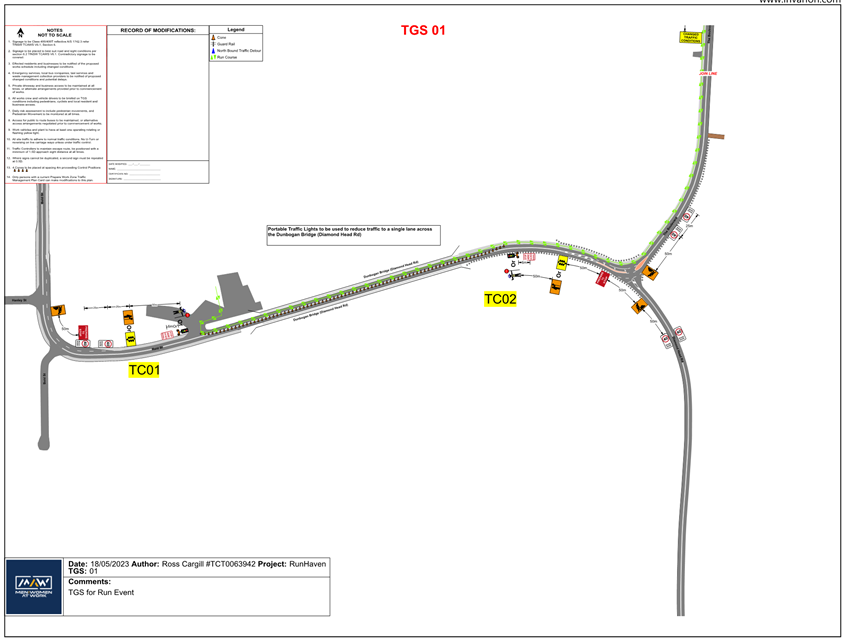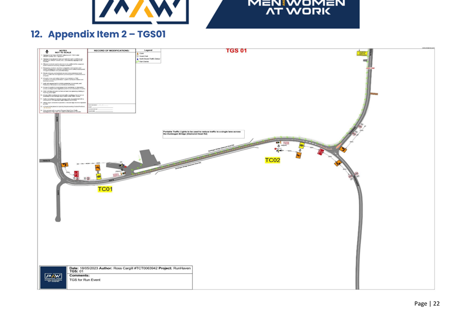 1. That the Transport Management Plan (TMP) and associated Traffic Guidance Scheme (TGS) be implemented. Any modifications to the plans must be agreed with Council prior to the running of the event.