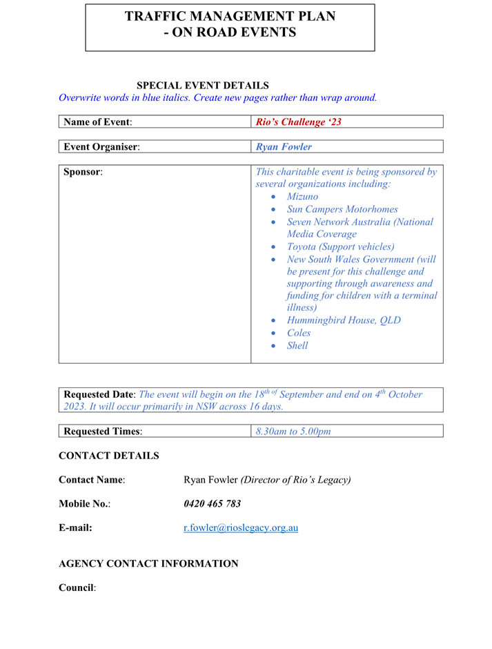 That Council approve the transport management arrangements associated with the Rios Legacy Charity Run on Tuesday - Wednesday, 26-27 September 2023, subject to the following conditions: