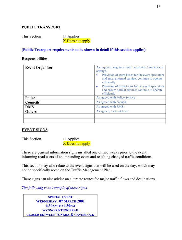 5. That the applicant organiser notifies local Transport Services (Bus Companies, Taxis) of the proposed road closure at least 28 days in advance of the works and assists in developing alternatives for affected users.